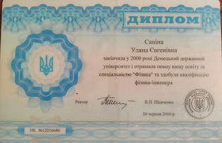 В 2011 г. на факультете переподготовки и повышения квалификации руководящих педагогических работников Донецкого национального университета (свидетельство №112/11 от 21 мая 2011г.). Курс «Управление учебным заведением» и преподавание предмета информатика. Выполнила выпускную работу на тему «Концепция многопрофильной школы с углубленным изучение отдельных предметов» и реферативную работу на тему «Метод проектов на уроках базового курса информатики». •